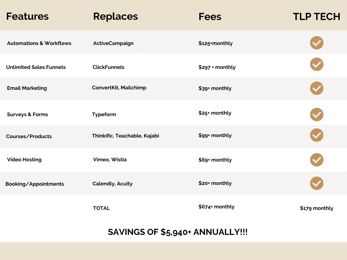 I created TLP Tech to be the all-in-one platform you need as a health or wellness expert who wants to market, sell and serve people online. We've built our entire system on top of a powerful CRM called "HighLevel" which allows us to the best of both worlds. A powerful tech platform AND the customization of a health expert.